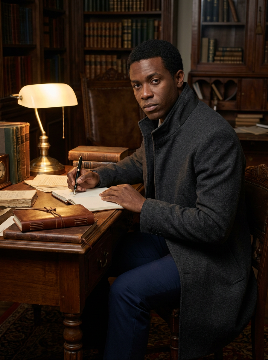 model writing with fountain pen, dark academia study, vintage desk lamp, leather-bound journals, scholarly atmosphere