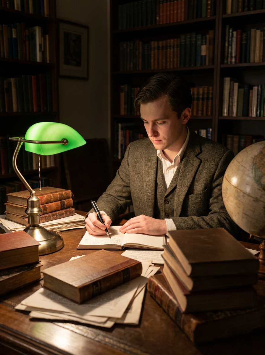 model writing with fountain pen, dark academia study, vintage desk lamp, leather-bound journals, scholarly atmosphere