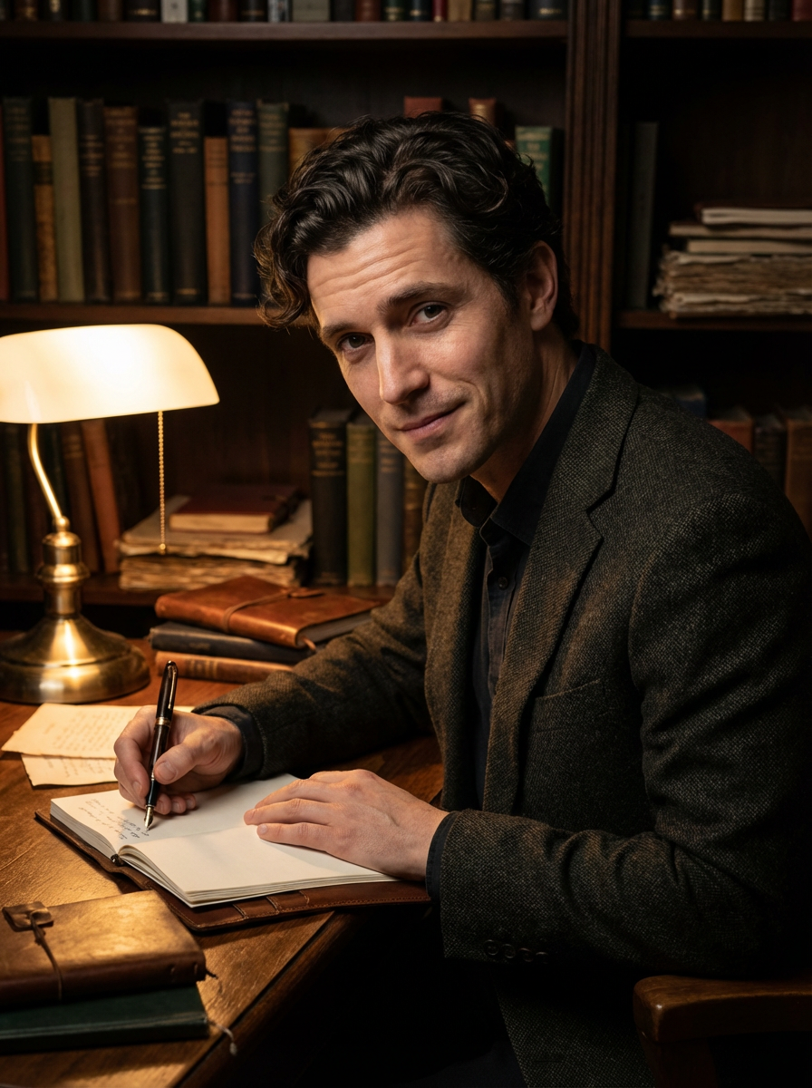 model writing with fountain pen, dark academia study, vintage desk lamp, leather-bound journals, scholarly atmosphere