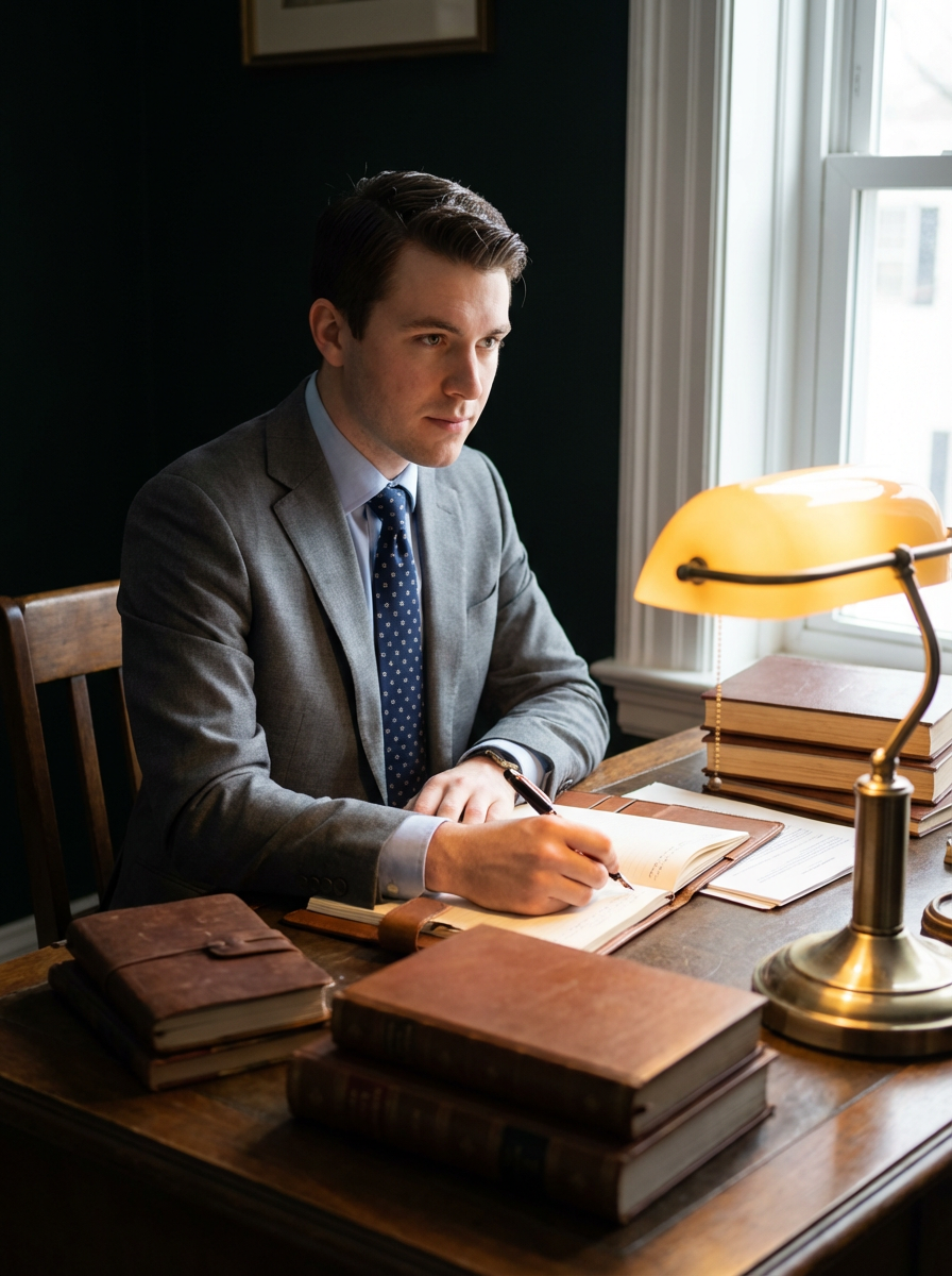 model writing with fountain pen, dark academia study, vintage desk lamp, leather-bound journals, scholarly atmosphere