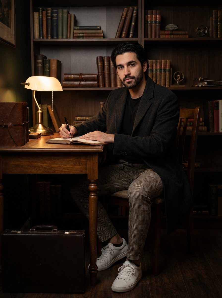model writing with fountain pen, dark academia study, vintage desk lamp, leather-bound journals, scholarly atmosphere