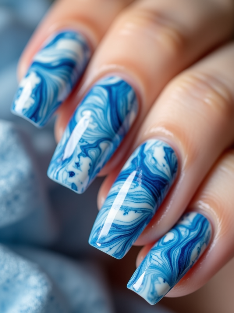 marble effect nails in blue and white, luxury nail spa vibe, macro shot, detailed swirling texture, artistic styling