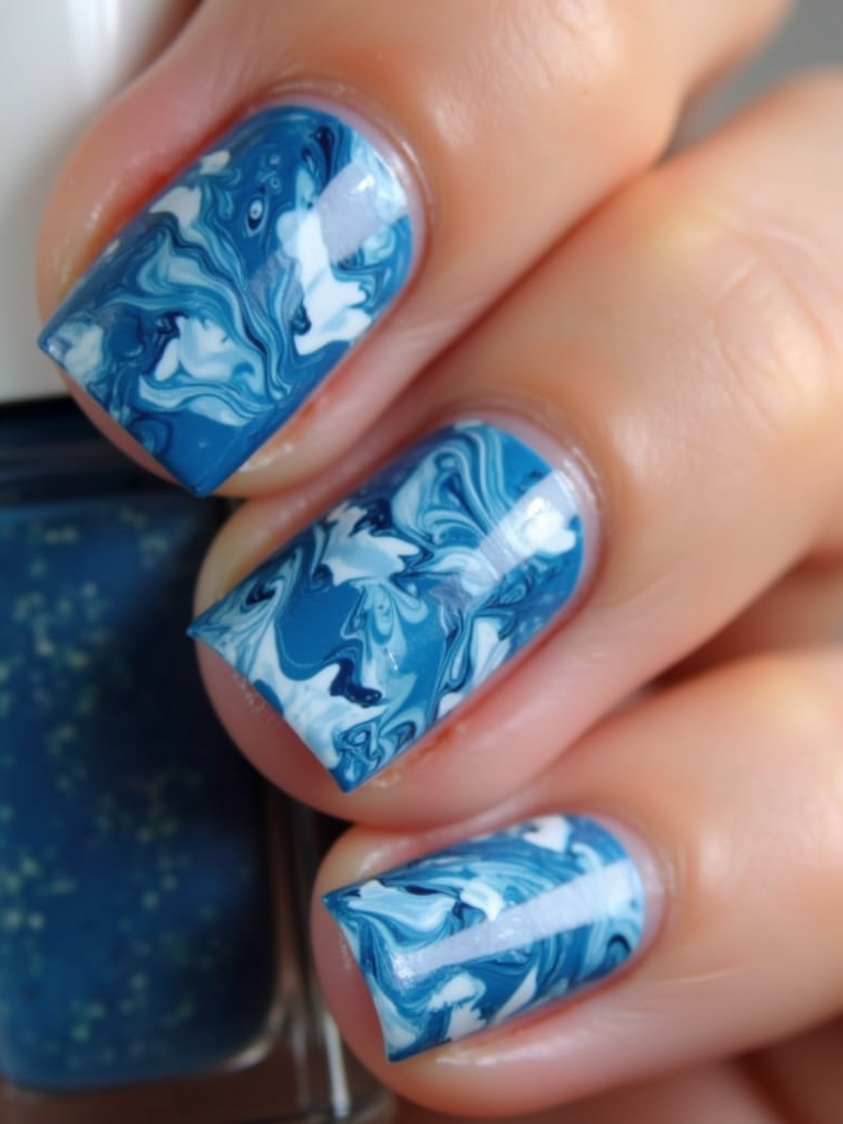 marble effect nails in blue and white, luxury nail spa vibe, macro shot, detailed swirling texture, artistic styling