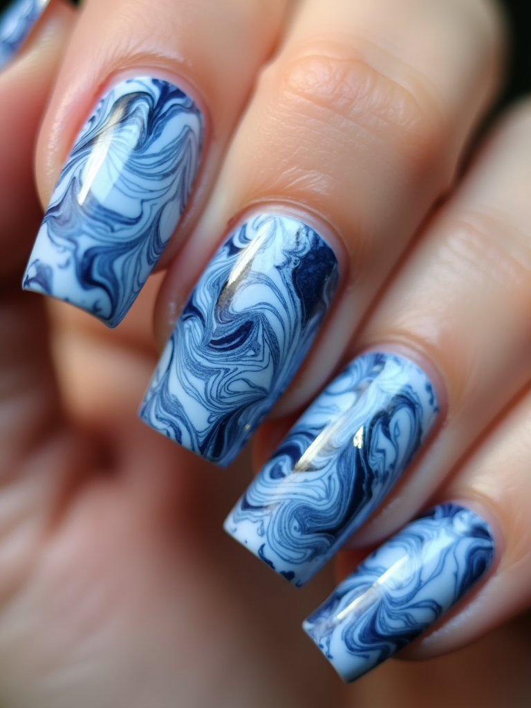 marble effect nails in blue and white, luxury nail spa vibe, macro shot, detailed swirling texture, artistic styling