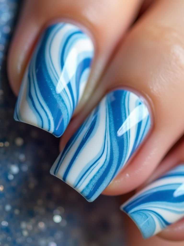 marble effect nails in blue and white, luxury nail spa vibe, macro shot, detailed swirling texture, artistic styling