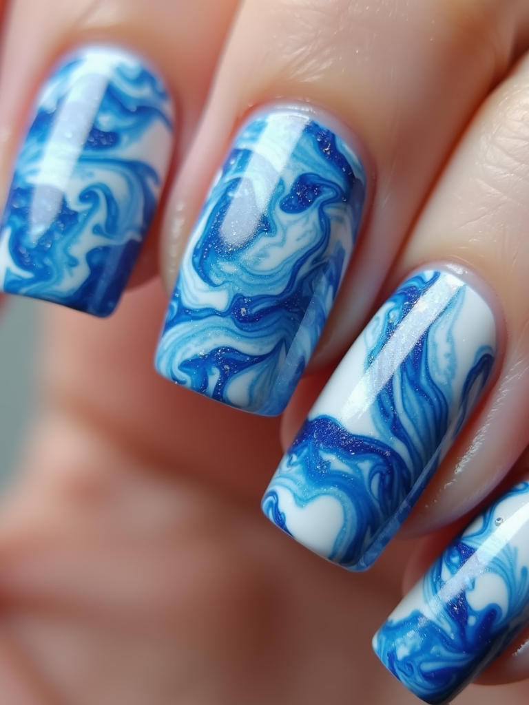 marble effect nails in blue and white, luxury nail spa vibe, macro shot, detailed swirling texture, artistic styling