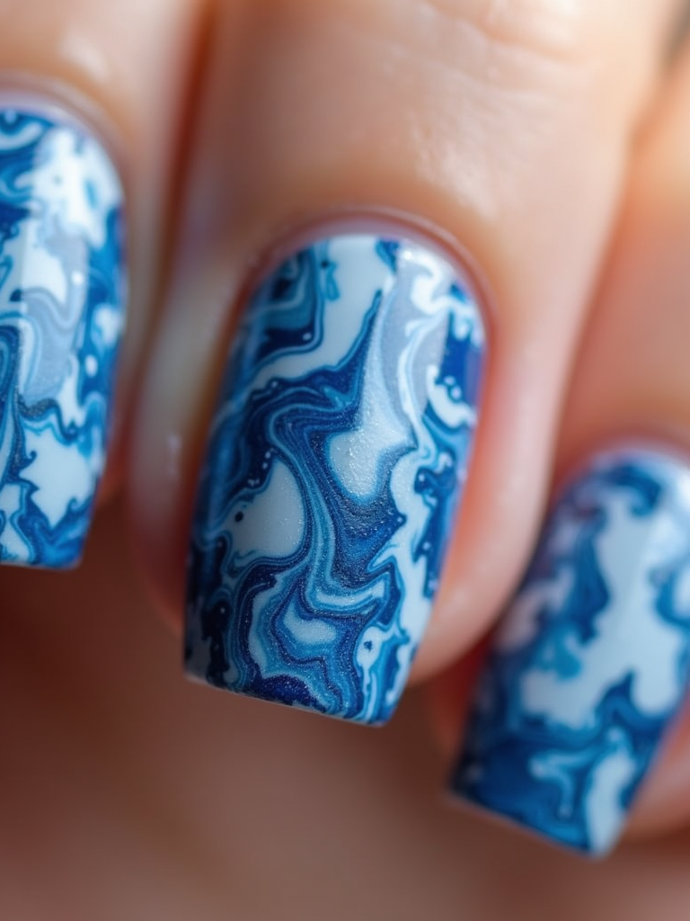 marble effect nails in blue and white, luxury nail spa vibe, macro shot, detailed swirling texture, artistic styling