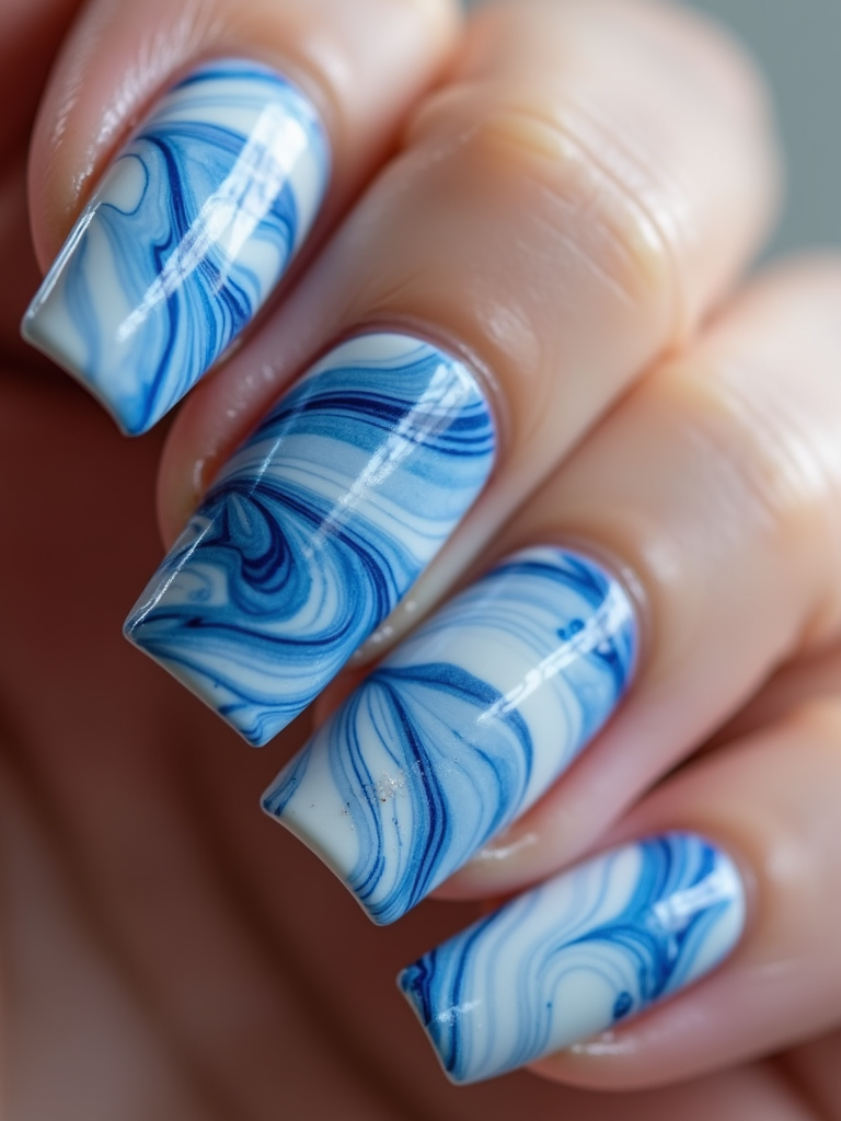 marble effect nails in blue and white, luxury nail spa vibe, macro shot, detailed swirling texture, artistic styling