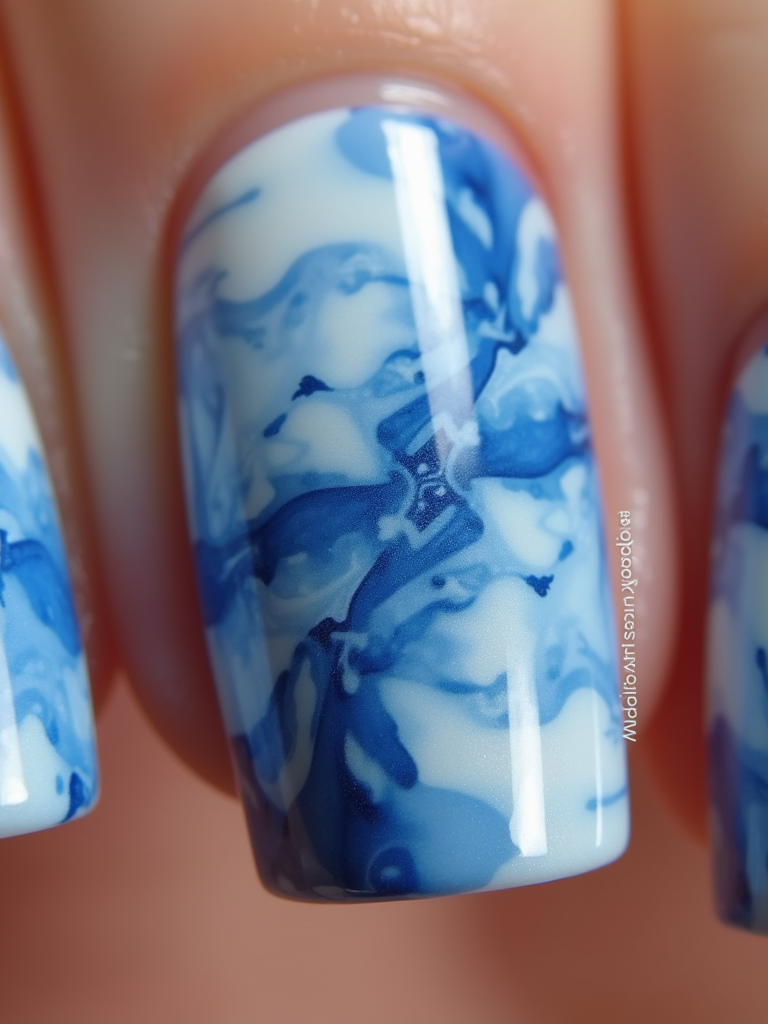 marble effect nails in blue and white, luxury nail spa vibe, macro shot, detailed swirling texture, artistic styling