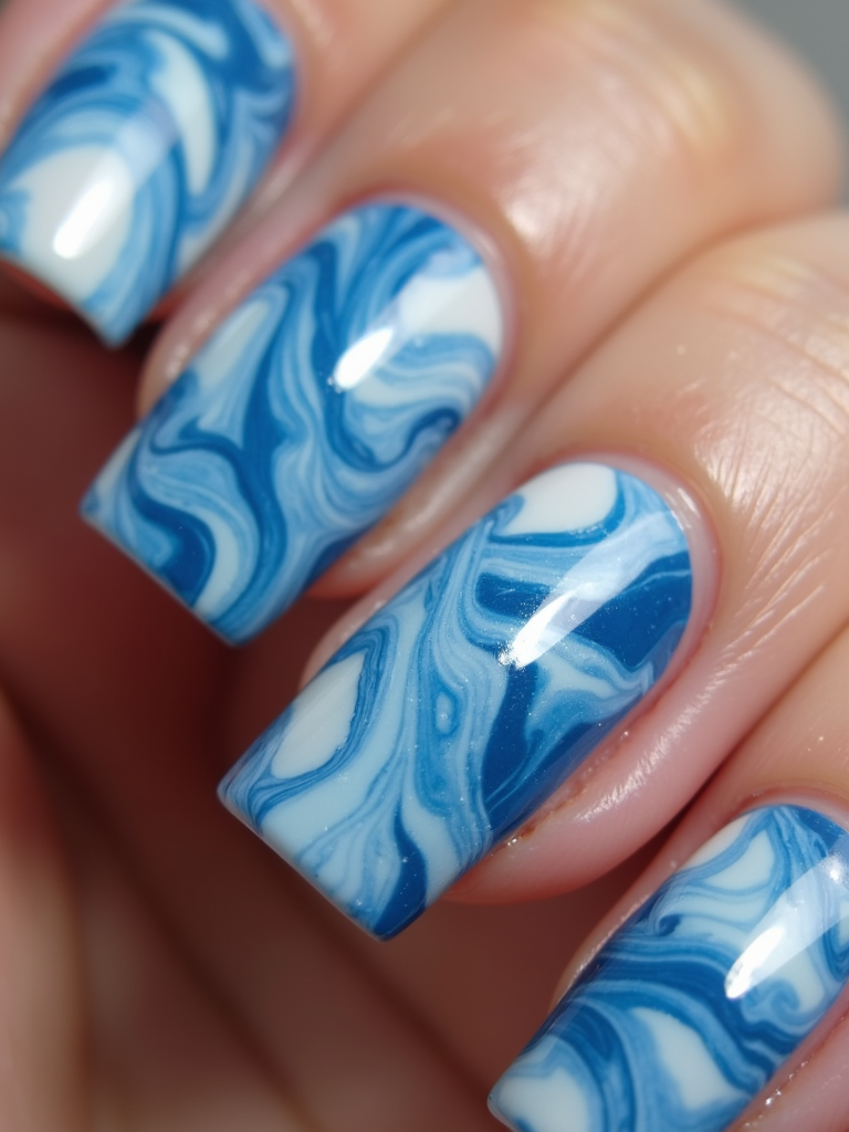 marble effect nails in blue and white, luxury nail spa vibe, macro shot, detailed swirling texture, artistic styling