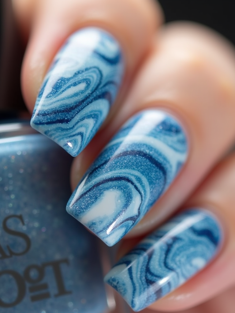 marble effect nails in blue and white, luxury nail spa vibe, macro shot, detailed swirling texture, artistic styling