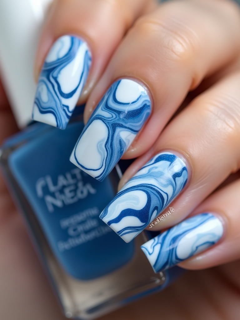 marble effect nails in blue and white, luxury nail spa vibe, macro shot, detailed swirling texture, artistic styling