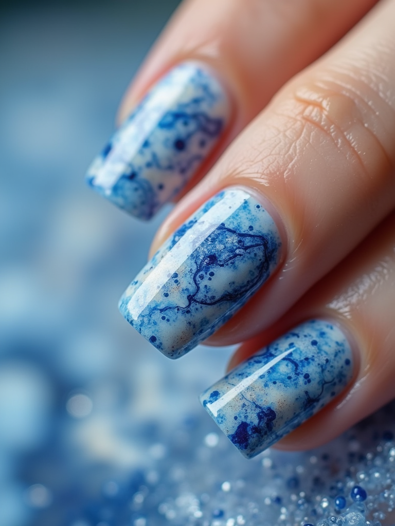 marble effect nails in blue and white, luxury nail spa vibe, macro shot, detailed swirling texture, artistic styling