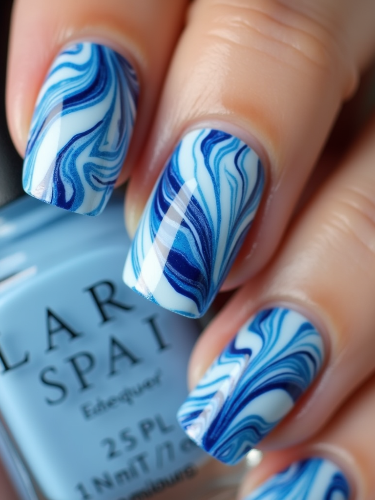 marble effect nails in blue and white, luxury nail spa vibe, macro shot, detailed swirling texture, artistic styling
