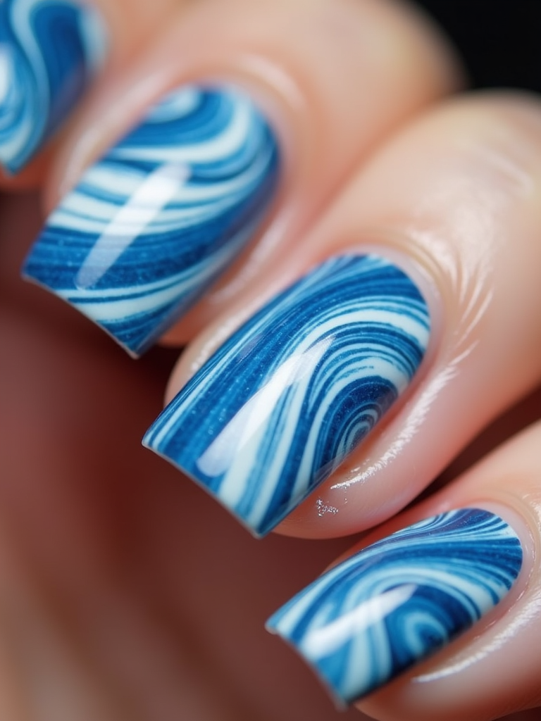 marble effect nails in blue and white, luxury nail spa vibe, macro shot, detailed swirling texture, artistic styling