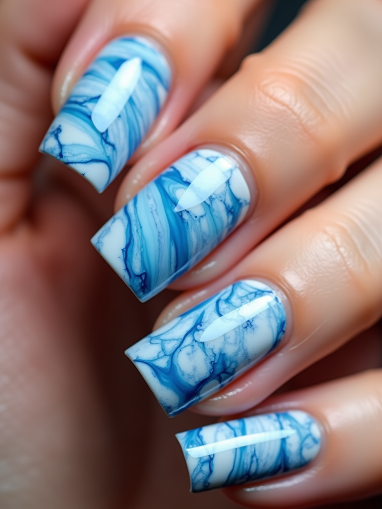 marble effect nails in blue and white, luxury nail spa vibe, macro shot, detailed swirling texture, artistic styling