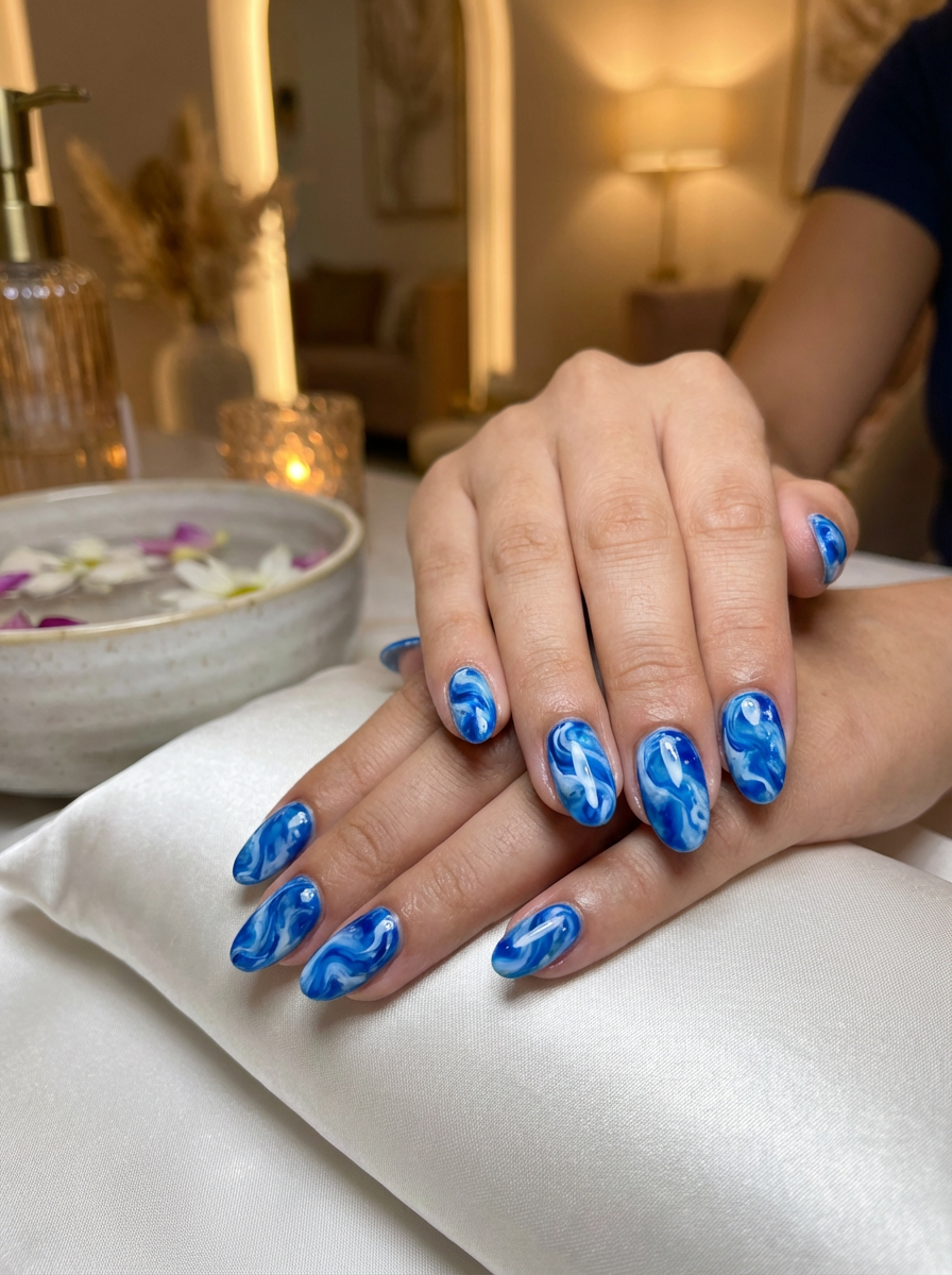 marble effect nails in blue and white, luxury nail spa vibe, macro shot, detailed swirling texture, artistic styling