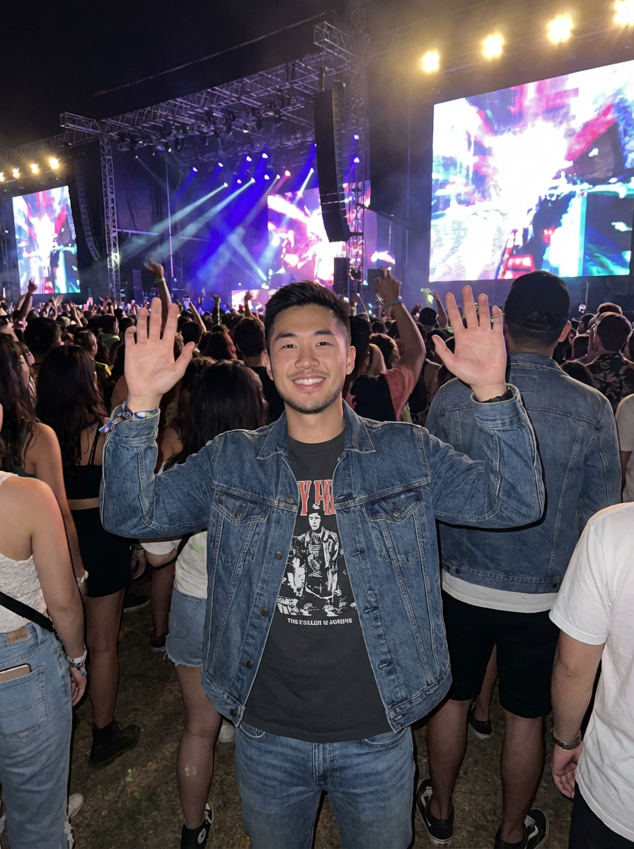 masculine model enjoying a concert or music festival
