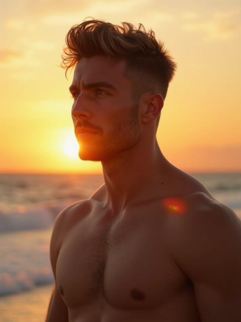 masculine model enjoying a sunset at a beach or park