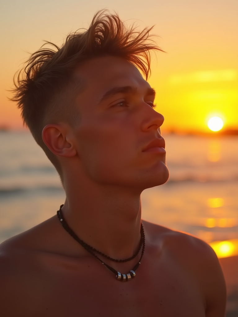 masculine model enjoying a sunset at a beach or park