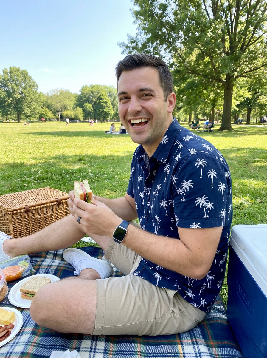 masculine model having a fun outdoor picnic