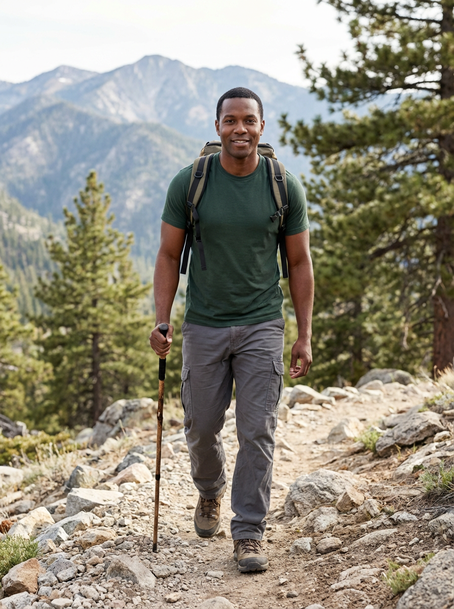 masculine model in going hiking outdoors in mountains