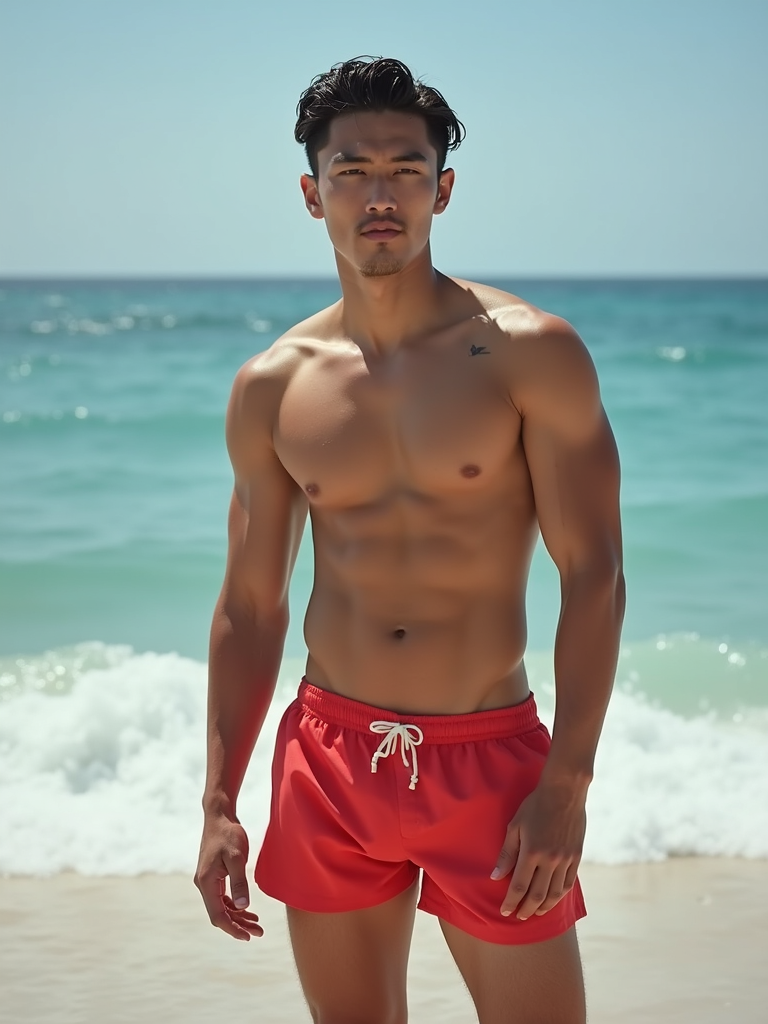 masculine model in solid color swim shorts on the beach, wet hair, swimsuit sports illustrated FHM maxim photos