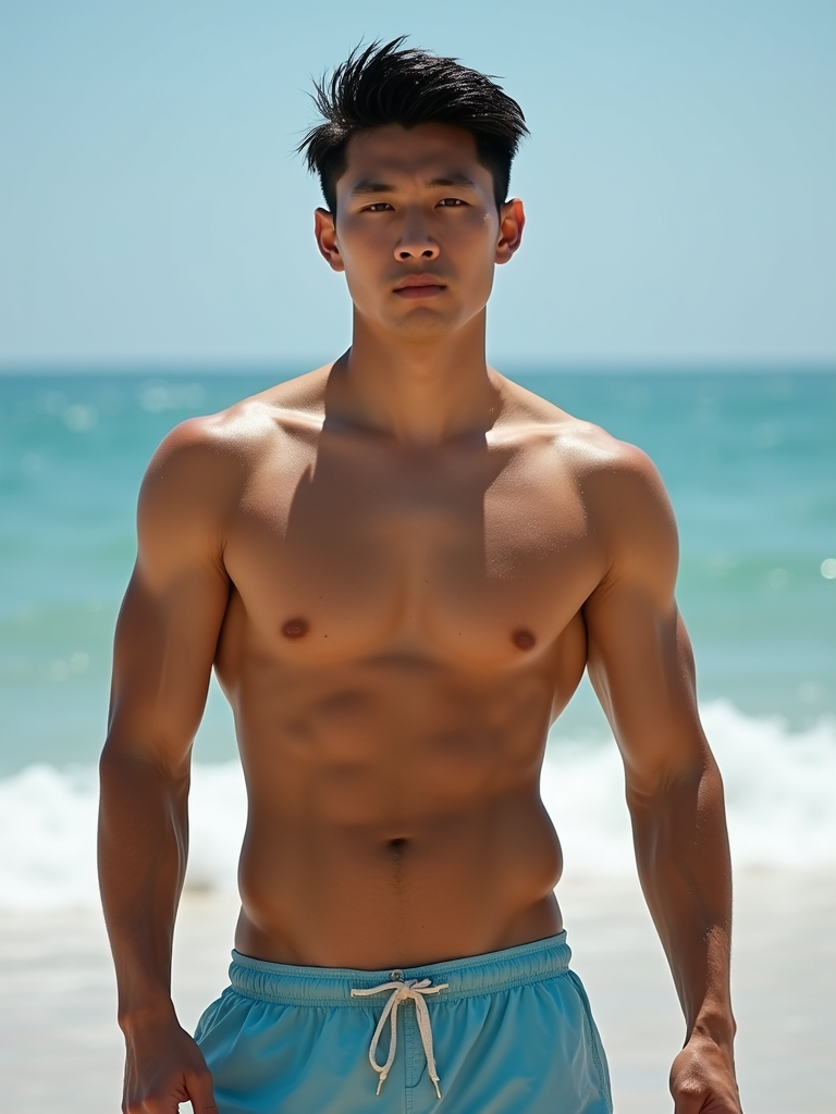 masculine model in solid color swim shorts on the beach, wet hair, swimsuit sports illustrated FHM maxim photos