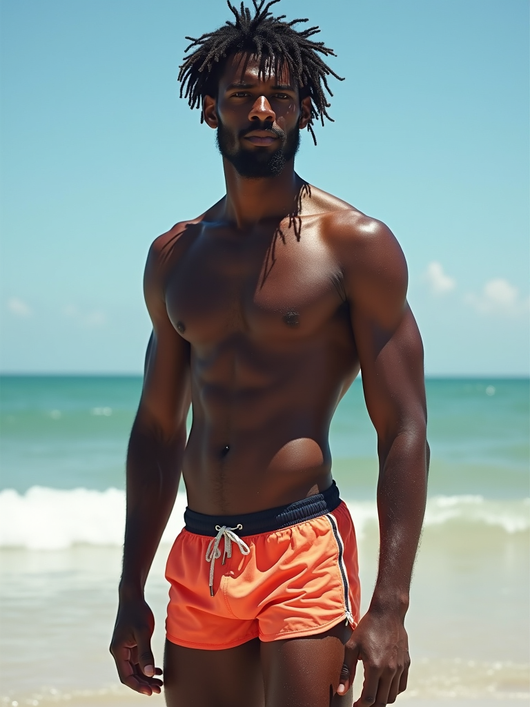 masculine model in solid color swim shorts on the beach, wet hair, swimsuit sports illustrated FHM maxim photos
