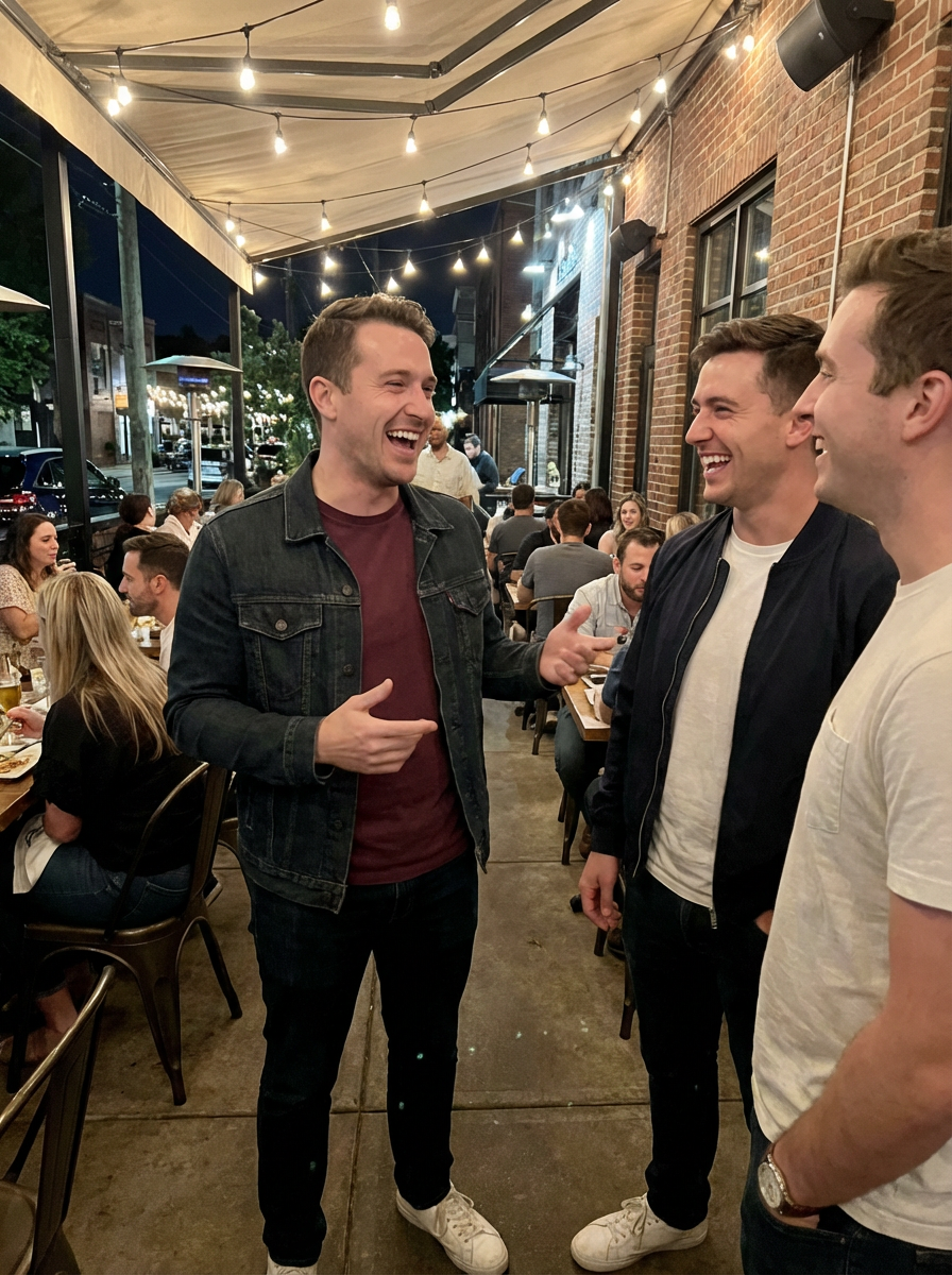 masculine model laughing and hanging out with friends