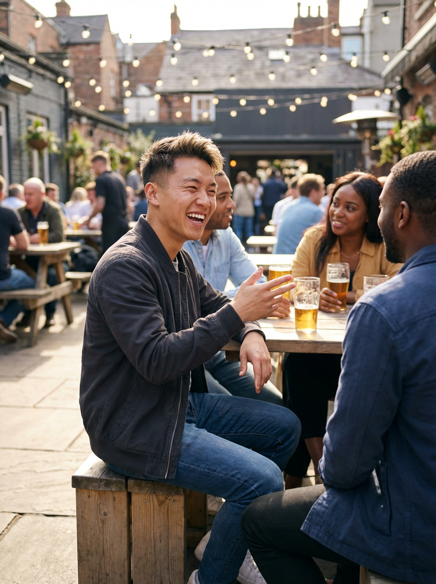 masculine model laughing and hanging out with friends