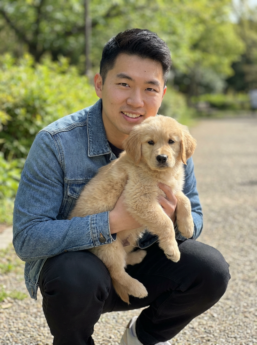 masculine model posing with a cute pet