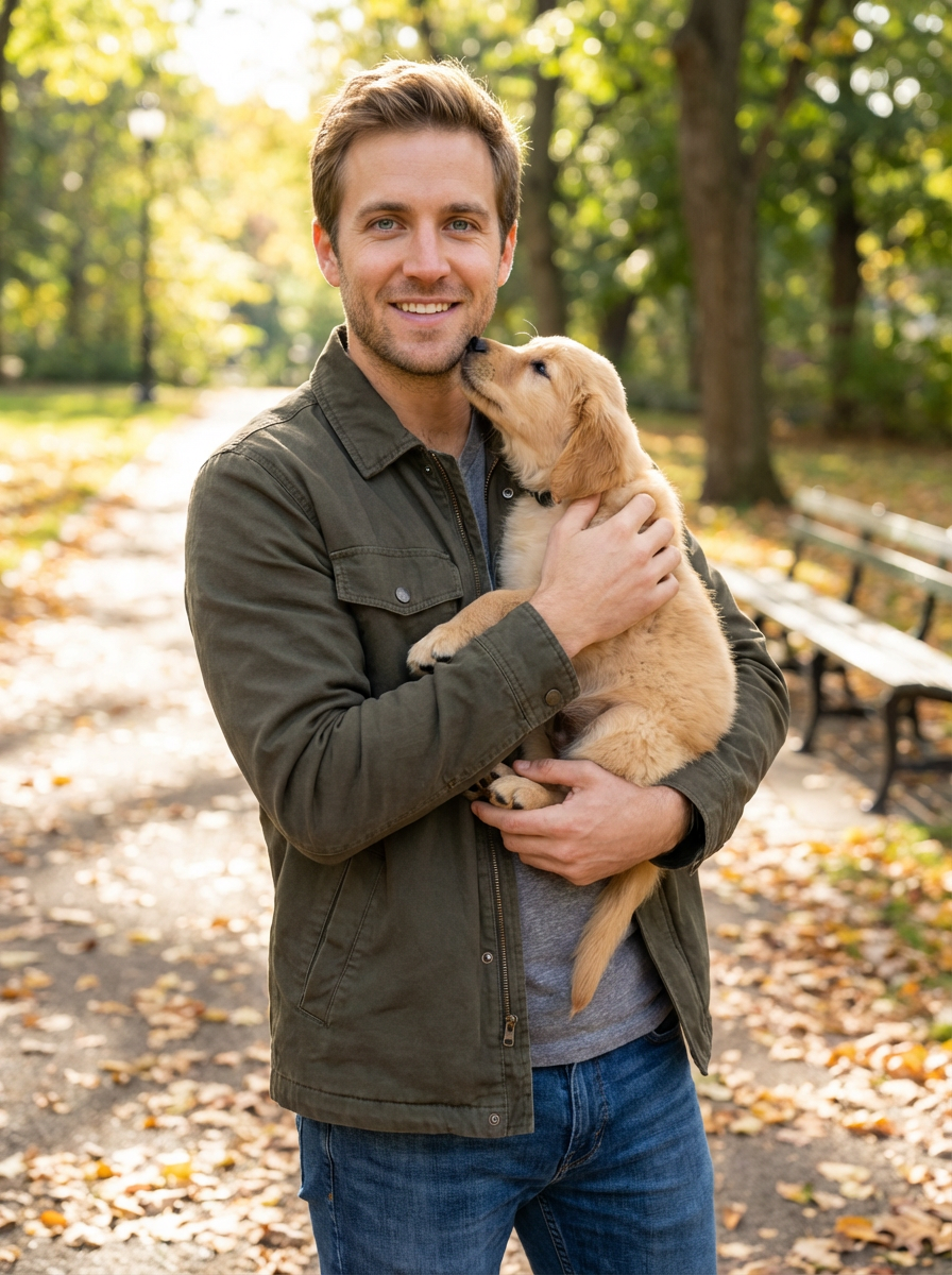 masculine model posing with a cute pet
