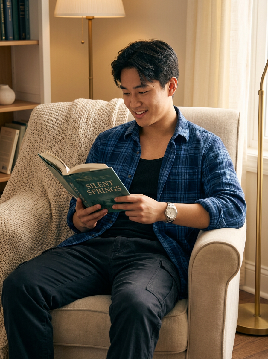 masculine model reading a book in a cozy home environment