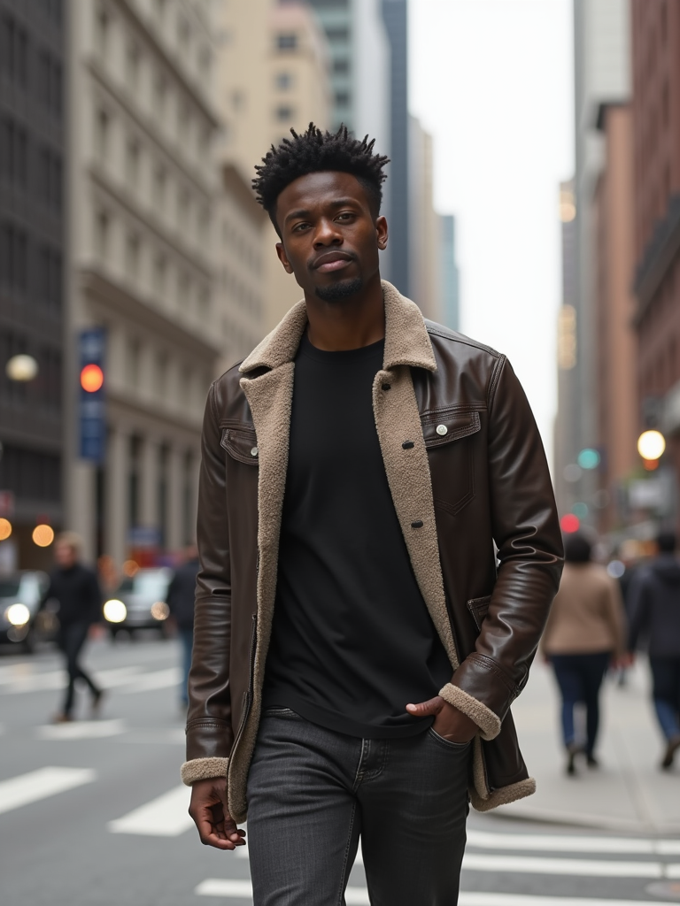 masculine model taking a casual stroll through a cityscape