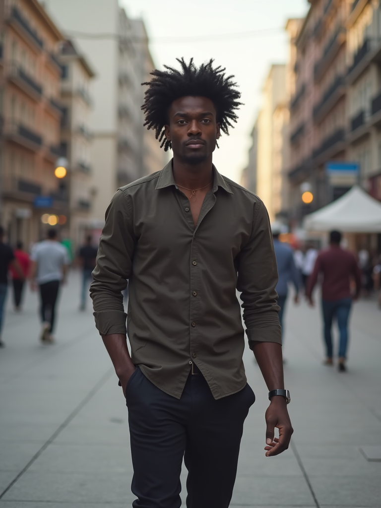 masculine model taking a casual stroll through a cityscape