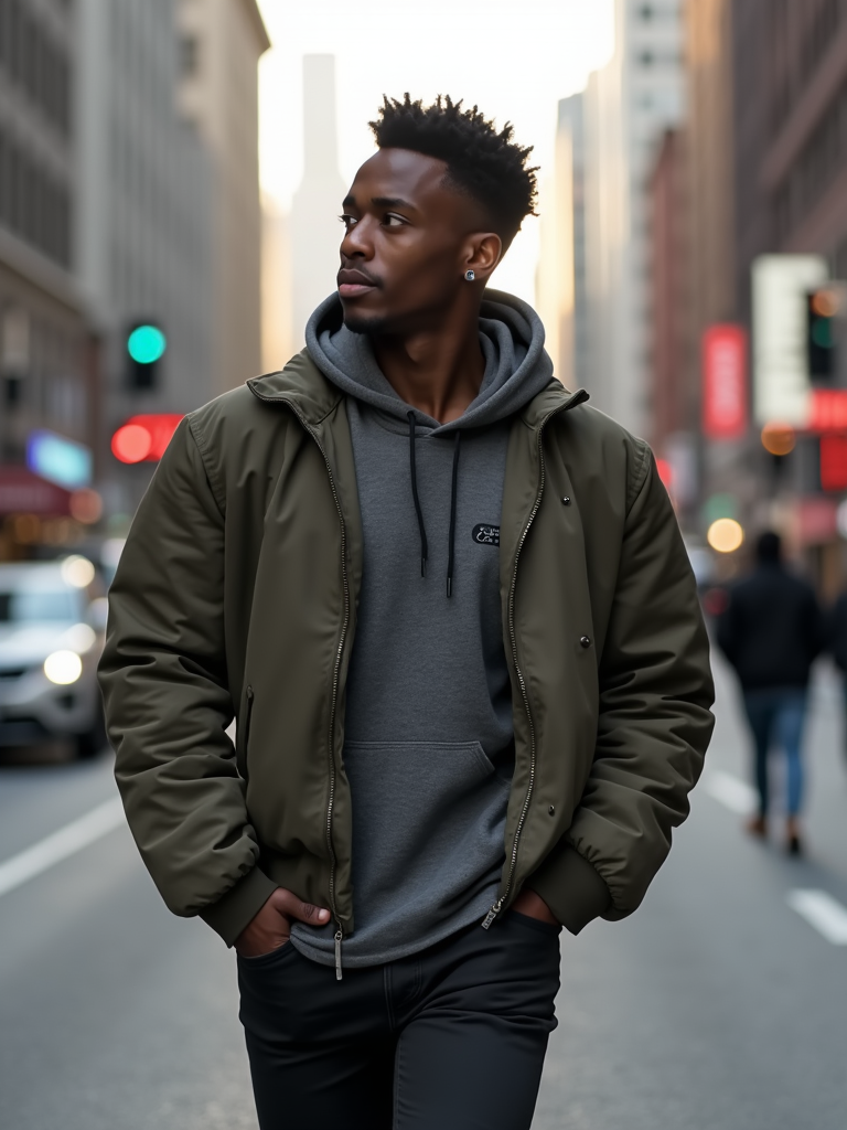 masculine model taking a casual stroll through a cityscape