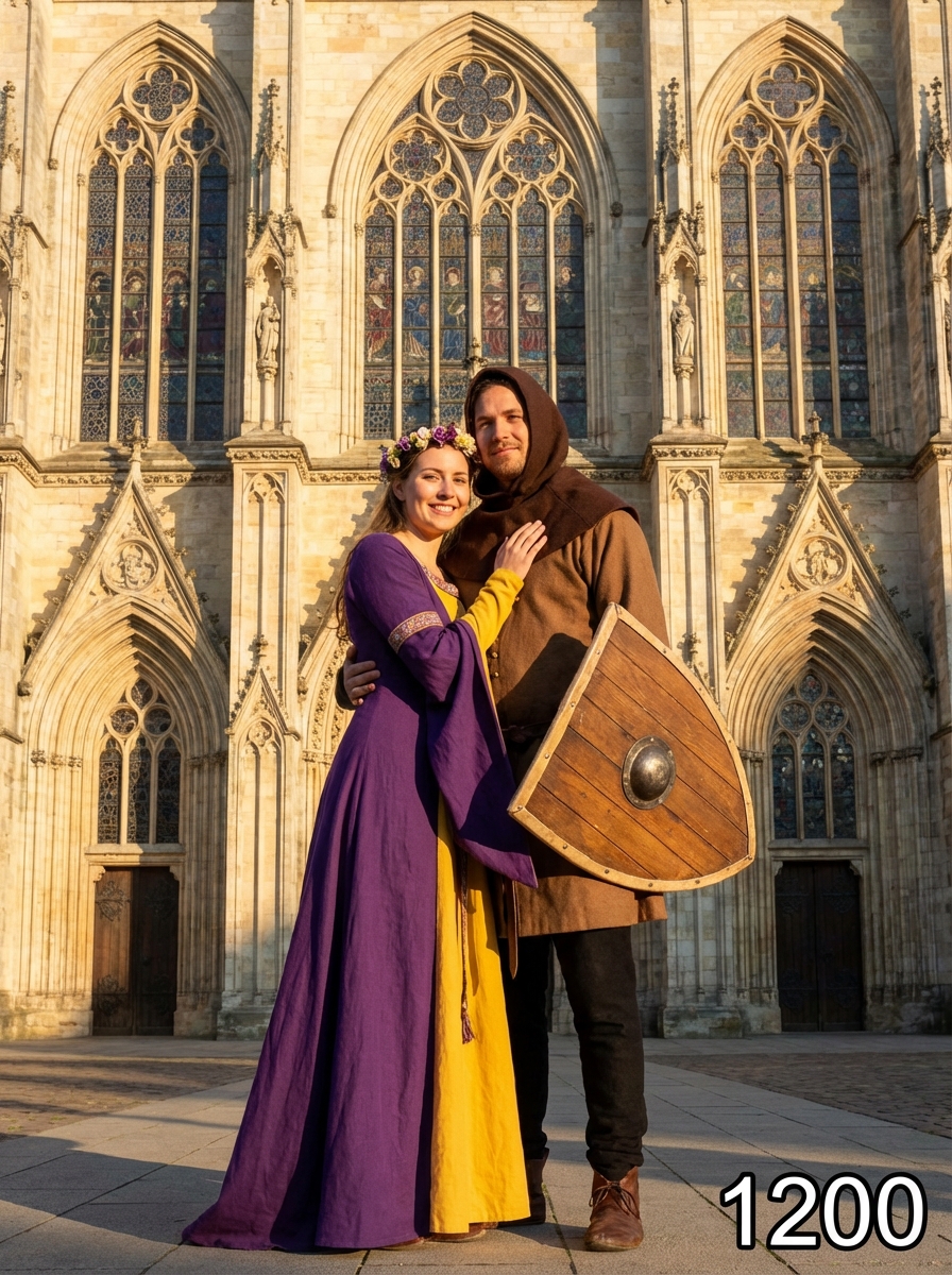 Medieval couple from 1200s in authentic medieval attire - long flowing dress with fitted bodice, simple veil or circlet , embracing in front of a Gothic cathedral with stained glass windows, text overlay in bottom corner reading "1200" in white sans serif font with black outline