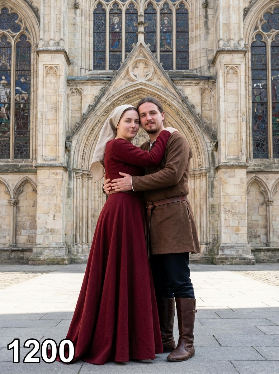 Medieval couple from 1200s in authentic medieval attire - long flowing dress with fitted bodice, simple veil or circlet , embracing in front of a Gothic cathedral with stained glass windows, text overlay in bottom corner reading "1200" in white sans serif font with black outline