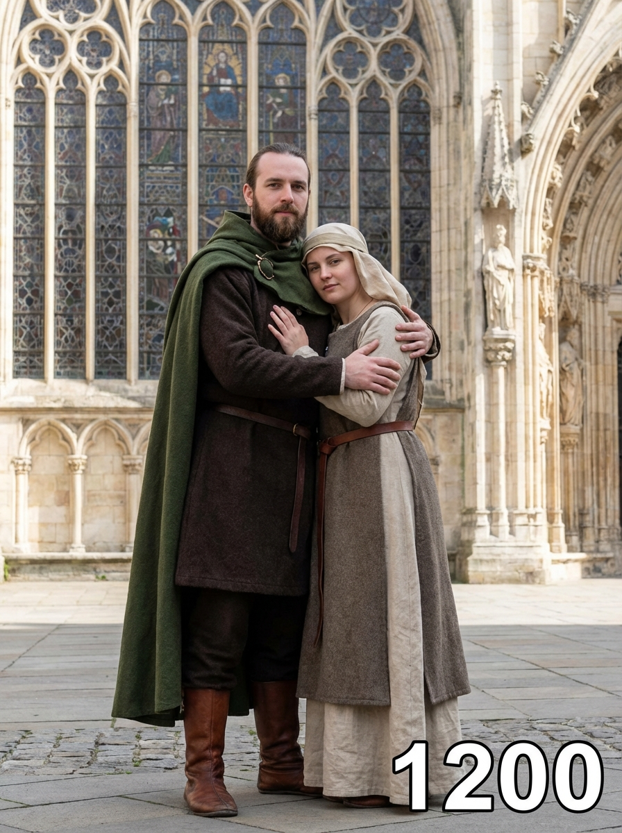 Medieval couple from 1200s in authentic medieval attire - tunic, cloak, leather boots, embracing in front of a Gothic cathedral with stained glass windows, text overlay in bottom corner reading "1200" in white sans serif font with black outline