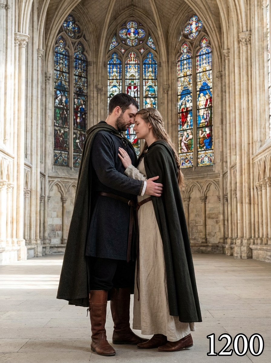 Medieval couple from 1200s in authentic medieval attire - tunic, cloak, leather boots, embracing in front of a Gothic cathedral with stained glass windows, text overlay in bottom corner reading "1200" in white sans serif font with black outline