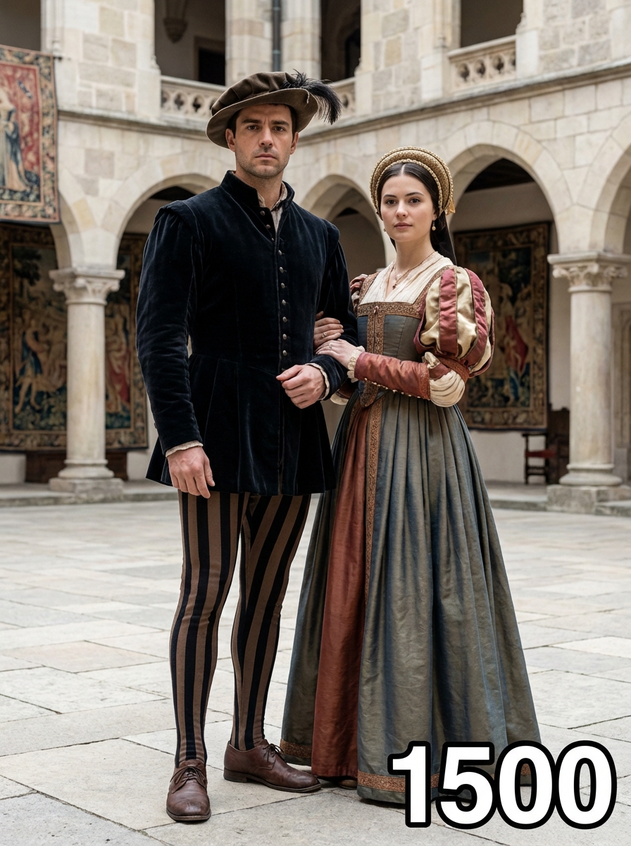 Medieval couple from 1500s in Renaissance period clothing - doublet, hose, feathered hat, standing together in a castle courtyard with stone architecture and tapestries, text overlay in bottom corner reading "1500" in white sans serif font with black outline