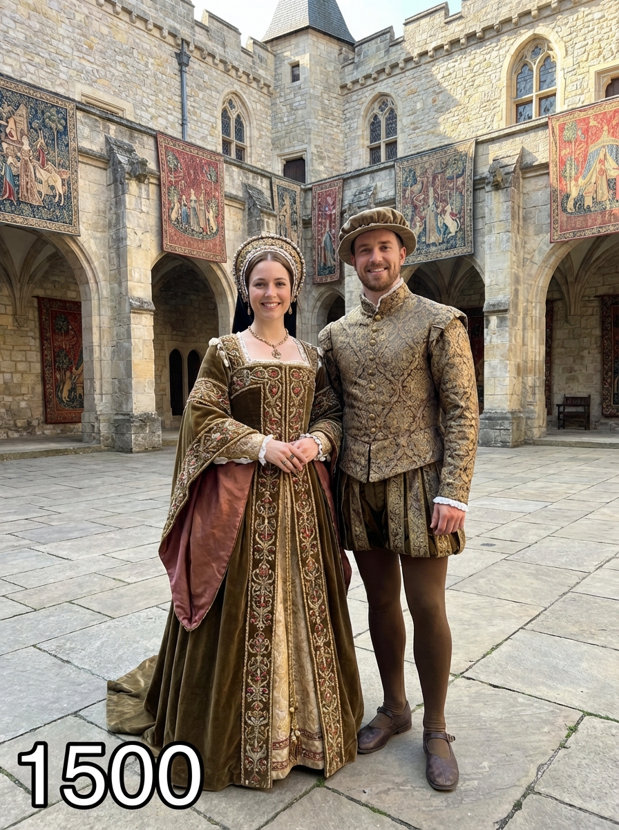 Medieval couple from 1500s in Renaissance period clothing - elaborate gown with corset, flowing sleeves, ornate headdress , standing together in a castle courtyard with stone architecture and tapestries, text overlay in bottom corner reading "1500" in white sans serif font with black outline