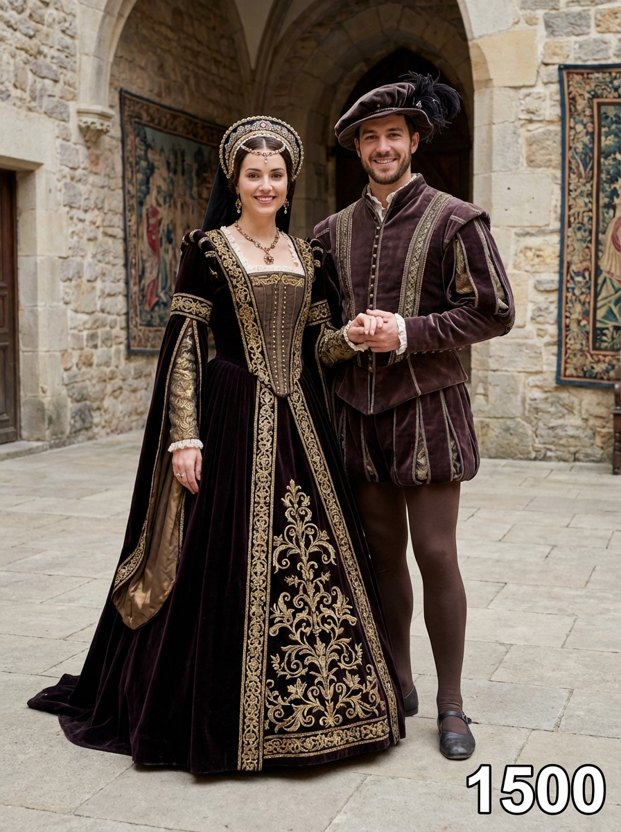 Medieval couple from 1500s in Renaissance period clothing - elaborate gown with corset, flowing sleeves, ornate headdress , standing together in a castle courtyard with stone architecture and tapestries, text overlay in bottom corner reading "1500" in white sans serif font with black outline