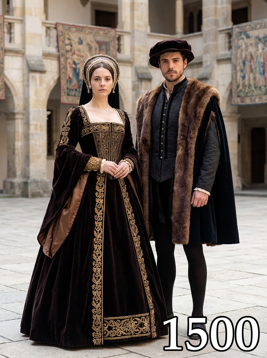Medieval couple from 1500s in Renaissance period clothing - elaborate gown with corset, flowing sleeves, ornate headdress , standing together in a castle courtyard with stone architecture and tapestries, text overlay in bottom corner reading "1500" in white sans serif font with black outline