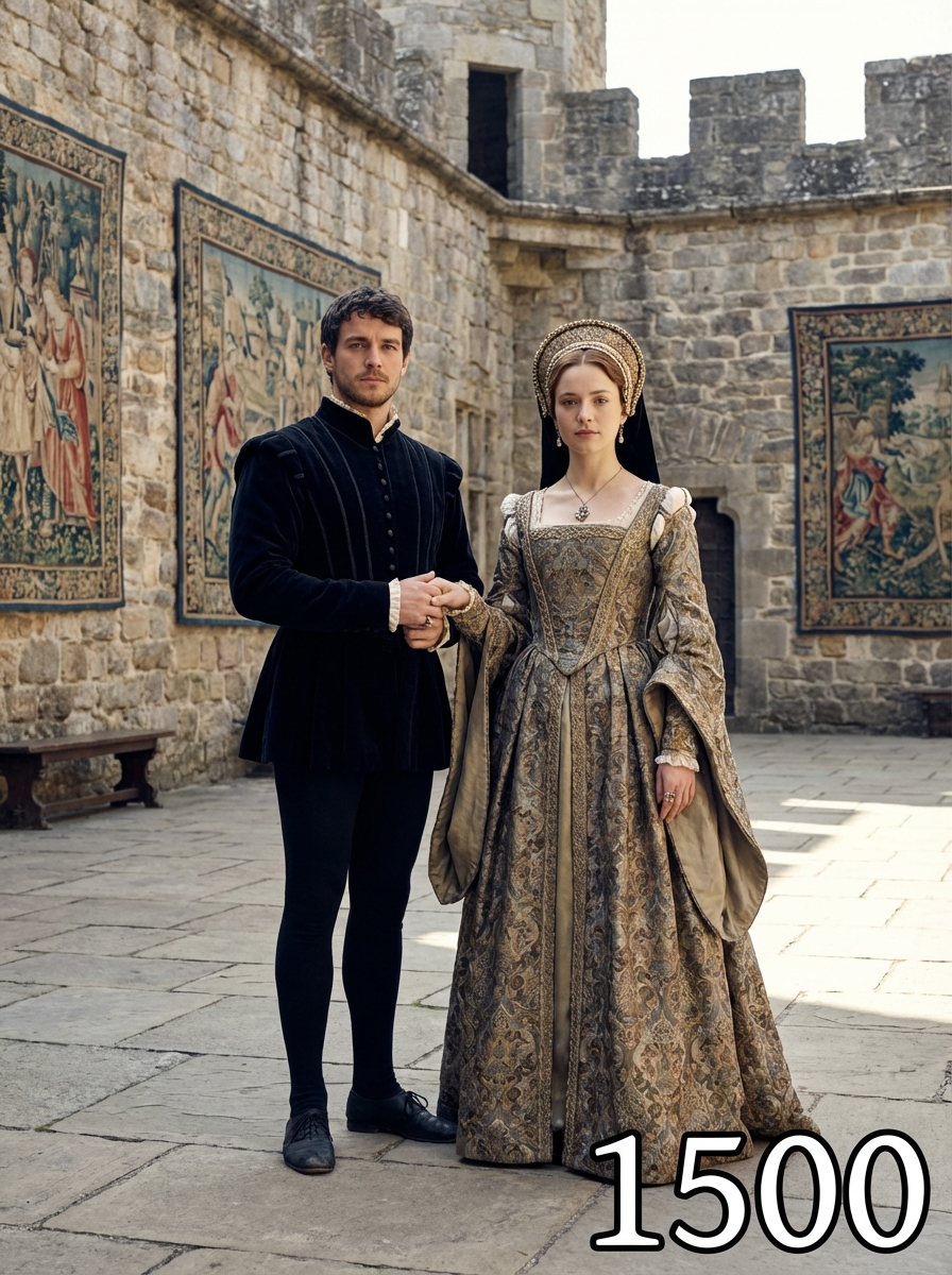 Medieval couple from 1500s in Renaissance period clothing - elaborate gown with corset, flowing sleeves, ornate headdress , standing together in a castle courtyard with stone architecture and tapestries, text overlay in bottom corner reading "1500" in white sans serif font with black outline