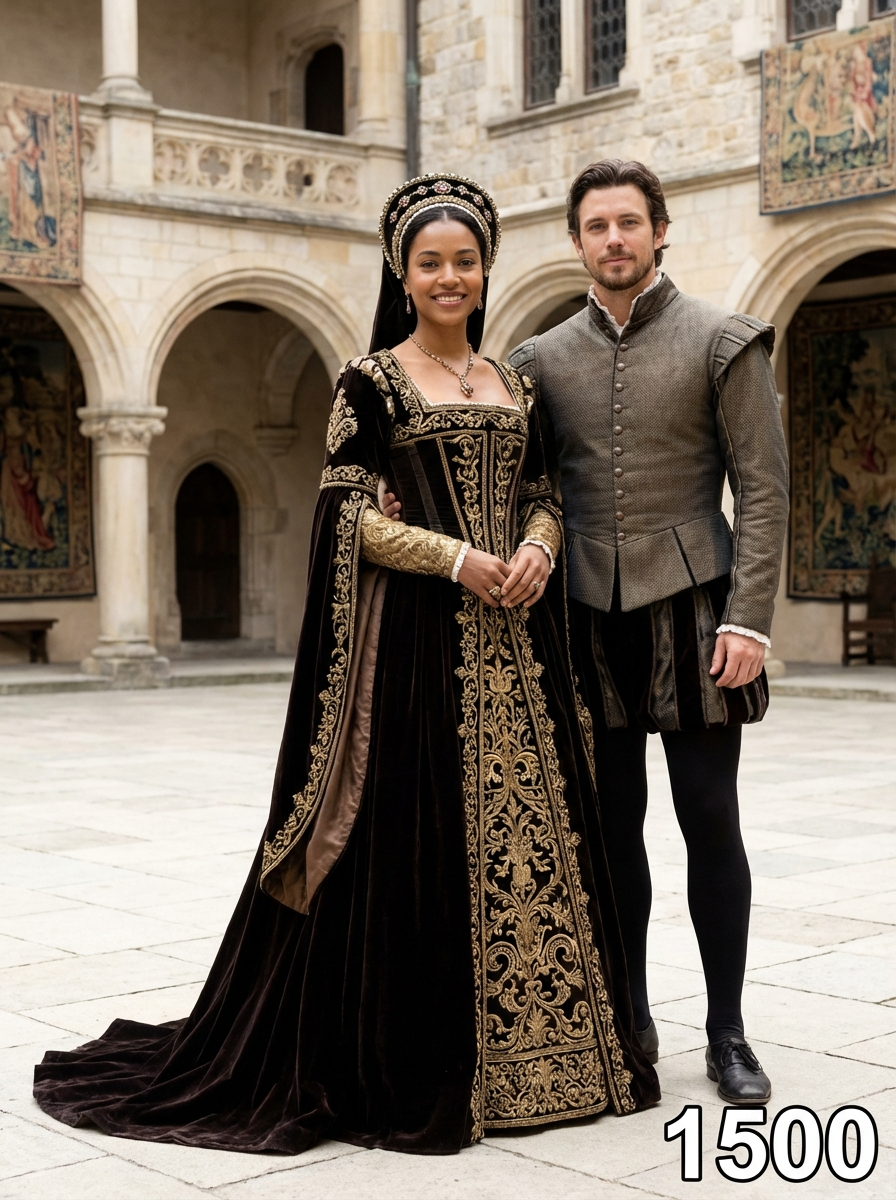 Medieval couple from 1500s in Renaissance period clothing - elaborate gown with corset, flowing sleeves, ornate headdress , standing together in a castle courtyard with stone architecture and tapestries, text overlay in bottom corner reading "1500" in white sans serif font with black outline