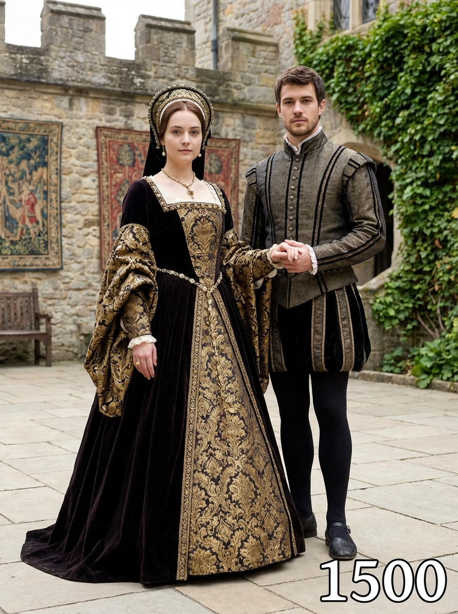 Medieval couple from 1500s in Renaissance period clothing - elaborate gown with corset, flowing sleeves, ornate headdress , standing together in a castle courtyard with stone architecture and tapestries, text overlay in bottom corner reading "1500" in white sans serif font with black outline