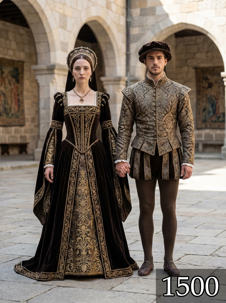 Medieval couple from 1500s in Renaissance period clothing - elaborate gown with corset, flowing sleeves, ornate headdress , standing together in a castle courtyard with stone architecture and tapestries, text overlay in bottom corner reading "1500" in white sans serif font with black outline
