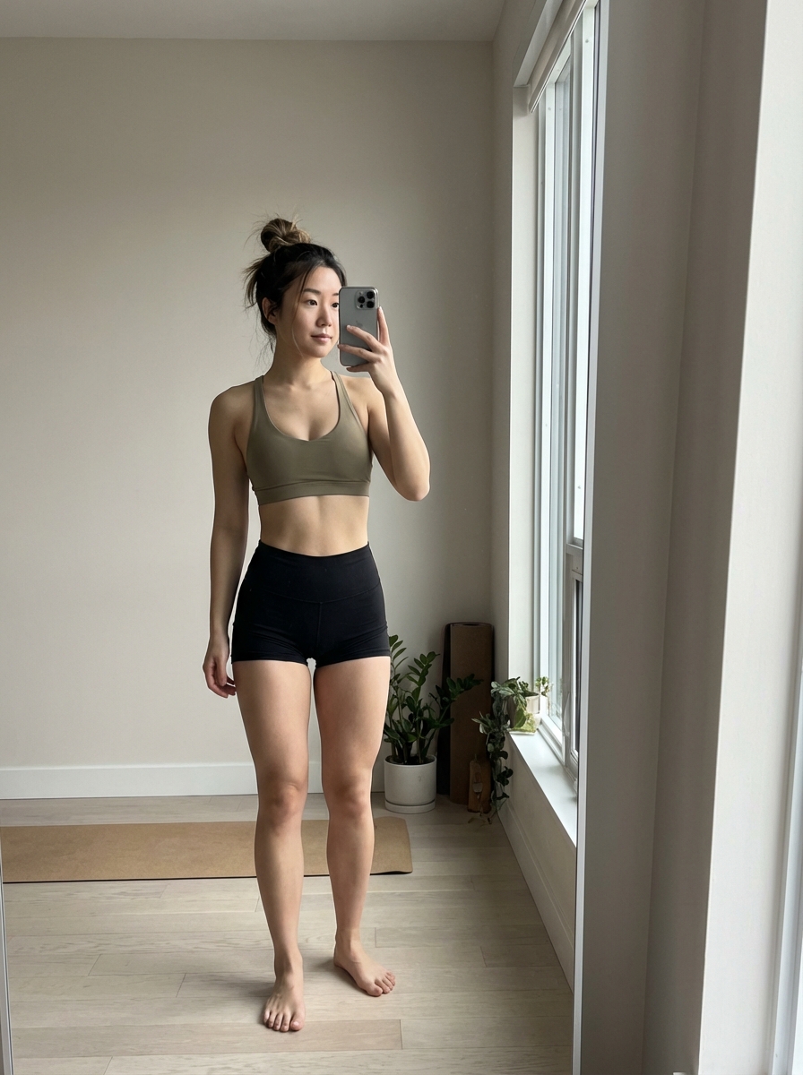{"meta": {"aspect_ratio": "9:16", "quality": "ultra_photorealistic", "resolution": "8K", "camera": "iPhone 15 Pro Max", "lens": "24mm wide", "style": "editorial fitness model mirror selfie, natural skin texture"}, "scene": {"location": "minimal apartment yoga corner with full-length mirror", "environment": ["clean mirror", "light wooden floor", "neutral walls", "soft daylight from window"], "time": "late afternoon"}, "lighting": {"type": "natural side daylight", "key_light": "cool window light", "fill_light": "soft ambient room light", "effect": "muscle definition, long lines and fabric tension clearly visible"}, "camera_perspective": {"pov": "mirror selfie — she is holding the phone", "angle": "slightly high, tilted downward", "framing": "upper thighs to head", "phone_visibility": "visible in mirror", "distance": "arm length"}, "subject": {"gender": "model", "age": "mid 20s (clearly adult)", "ethnicity": "", "body": {"type": "high-fashion fitness model", "height_effect": "long legs, elongated proportions", "waist": "very slim, sharp taper", "hips": "athletic but feminine curve ", "legs": "long, lean, defined quads and hamstrings", "glutes": "lifted, compact, model-athlete shape", "chest": "firm, proportional, natural"}, "hair": {hair, "style": "clean messy bun ", "details": "sleek with a few loose strands"}, "face": {"expression": "calm, confident, model-off-duty", "eyes": "relaxed, slightly intense gaze at phone", "jawline": "clean and defined", "makeup": "very minimal, dewy skin, clear lip gloss "}, "pose": {"stance": "classic model mirror stance", "hips": "shifted slightly back and to the side", "legs": "one leg straight, one subtly bent to elongate lines", "upper_body": "light torso twist creating S-curve", "shoulders": "relaxed, slightly back", "arms": {"phone_hand": "holding phone at chest height", "free_hand": "lightly resting on hip or thigh"}}, "outfit": {"top": {"type": "yoga sports bra ", "color": "khaki", "fabric": "ultra-thin performance fabric", "fit": "tight, sculpting", "detail": "natural fabric tension and subtle outlines visible under realistic light"}, "bottom": {"type": "ultra short yoga leggings / booty leggings ", hair, "length": "upper thigh", "fit": "second-skin, runway-tight", "detail": "fabric riding slightly due to stance, clean athletic seams"}}}, "mood": {"vibe": "editorial, elite, effortlessly sexy", "energy": "looks like a model who also trains hard"}}